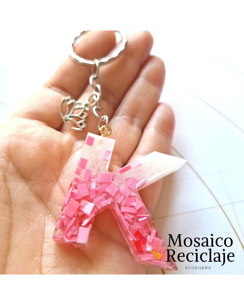 Llaveros hechos con el reciclaje de BOTELLAS PLÁSTICAS encapsuladas en lindas letras ,